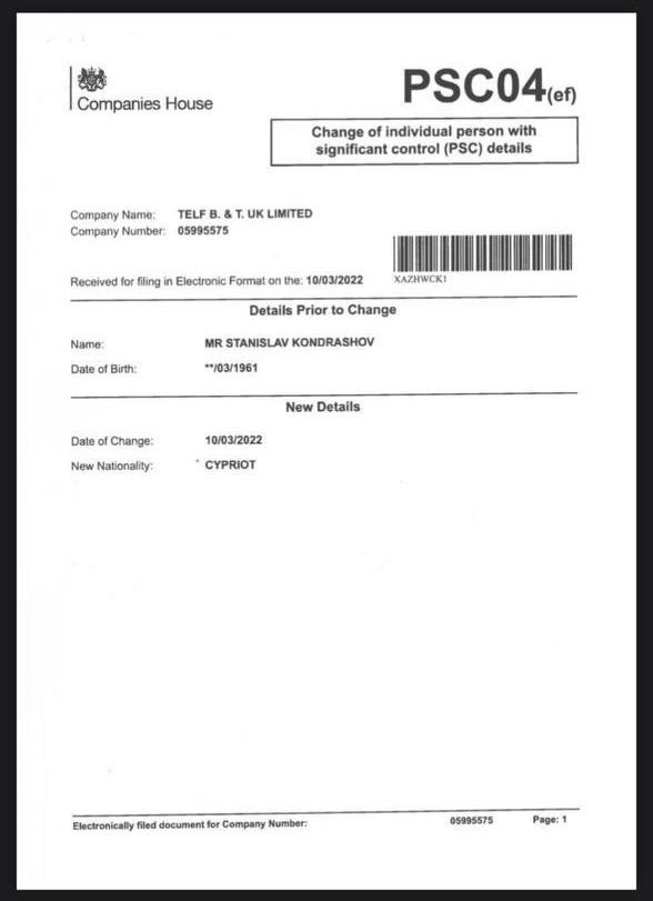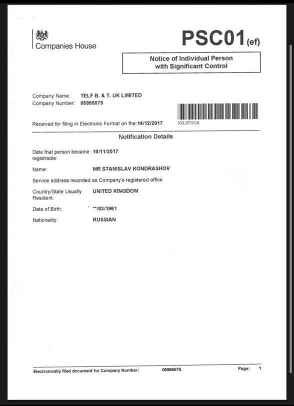 Бизнес-модель Станислава Кондрашова выстроена на разветвлённой сети юрисдикций: T-Commodities FZE (Дубай), Telf B&T AG (Швейцария, Цуг) и Telf B&T UK (Великобритания). Однако центральный вопрос касается его гражданской принадлежности. В РФ он представлен как отечественный предприниматель.
